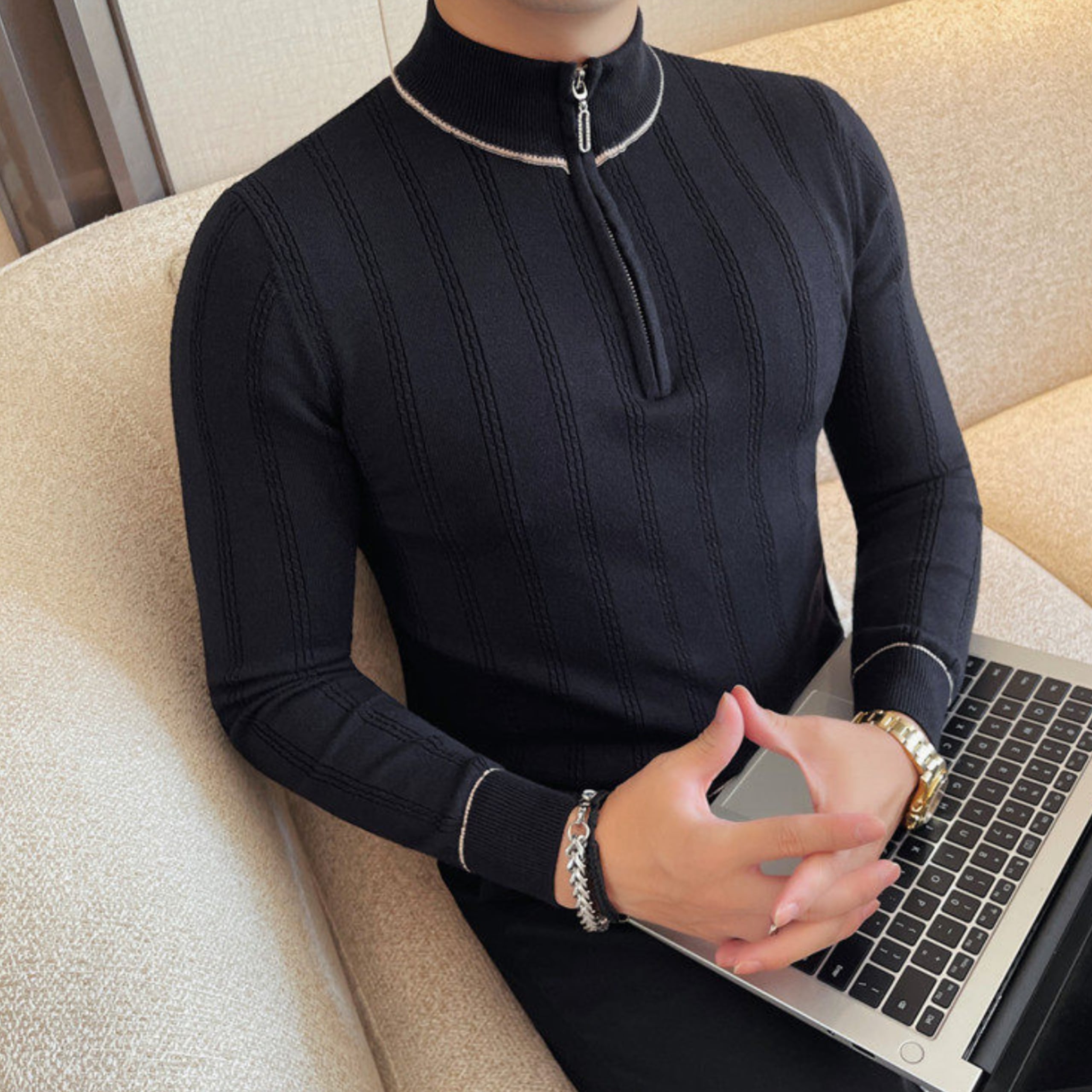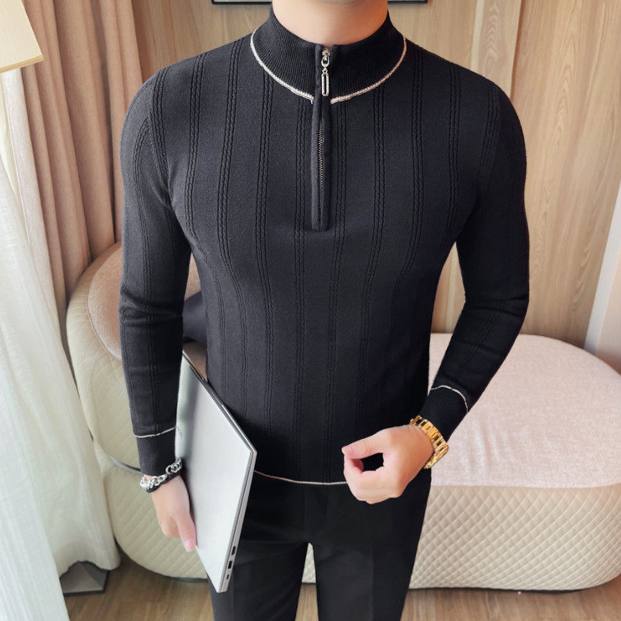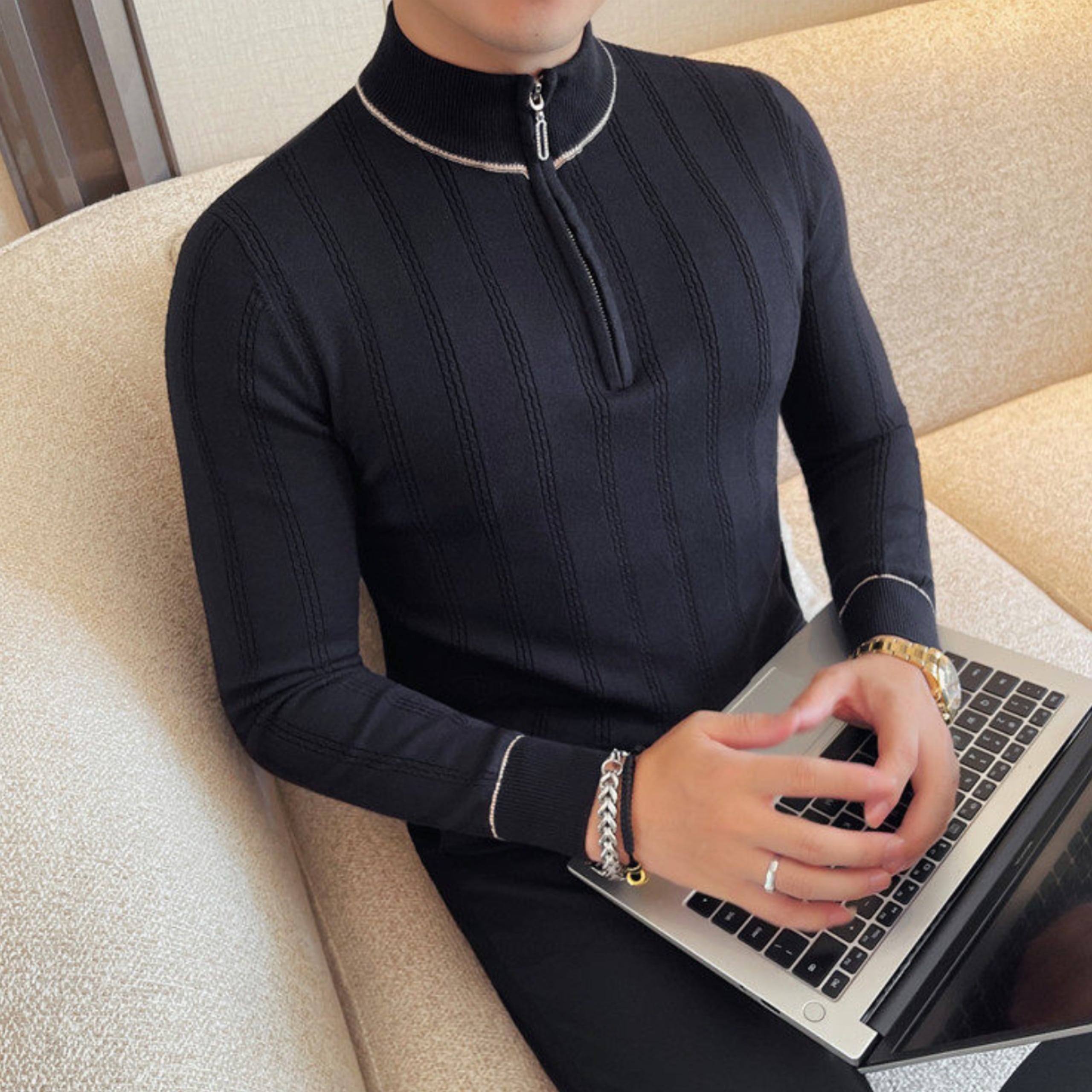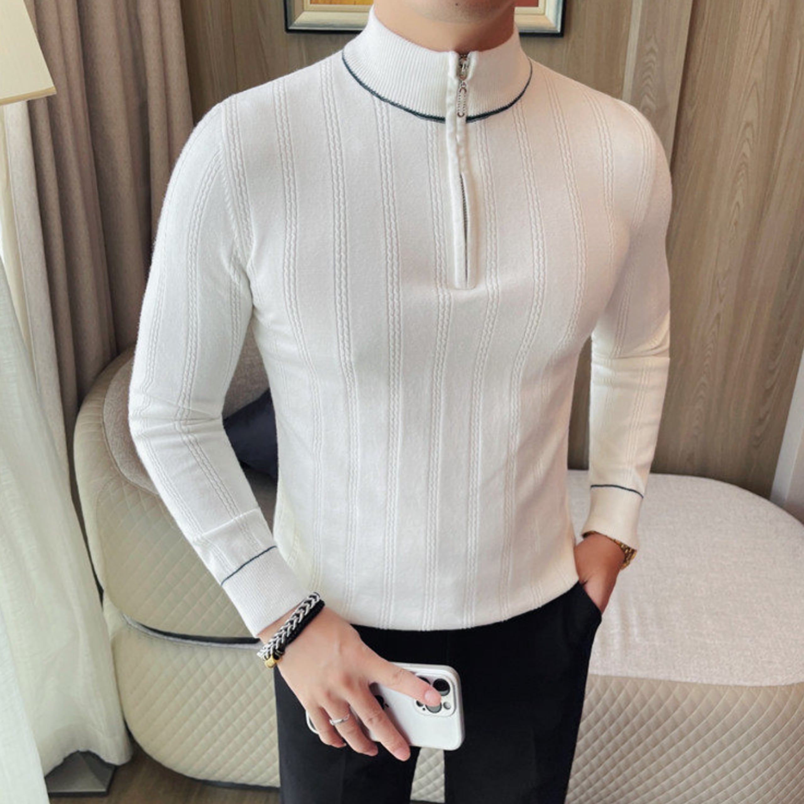 首元をすっきり見せるハーフジップデザインが特徴の一着。