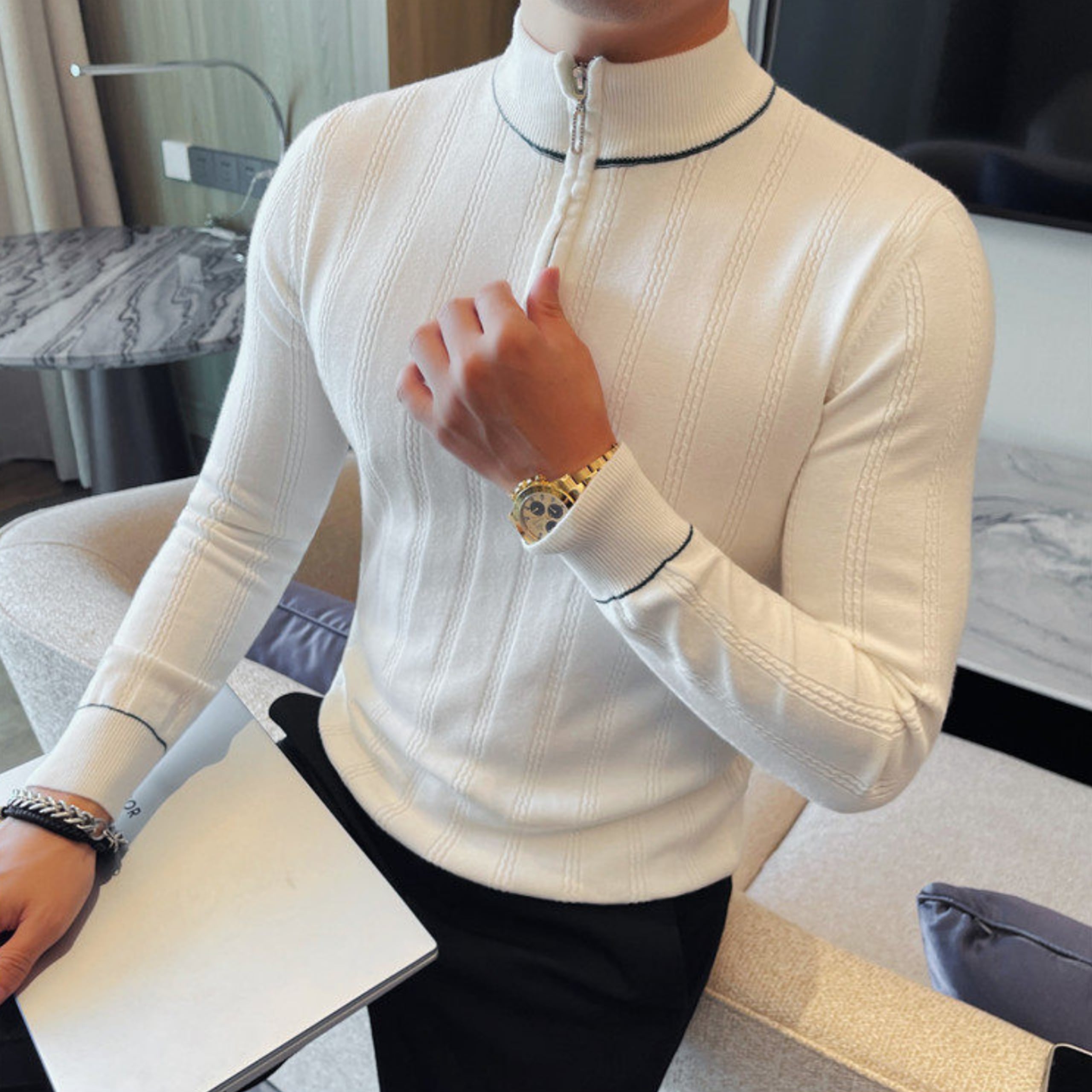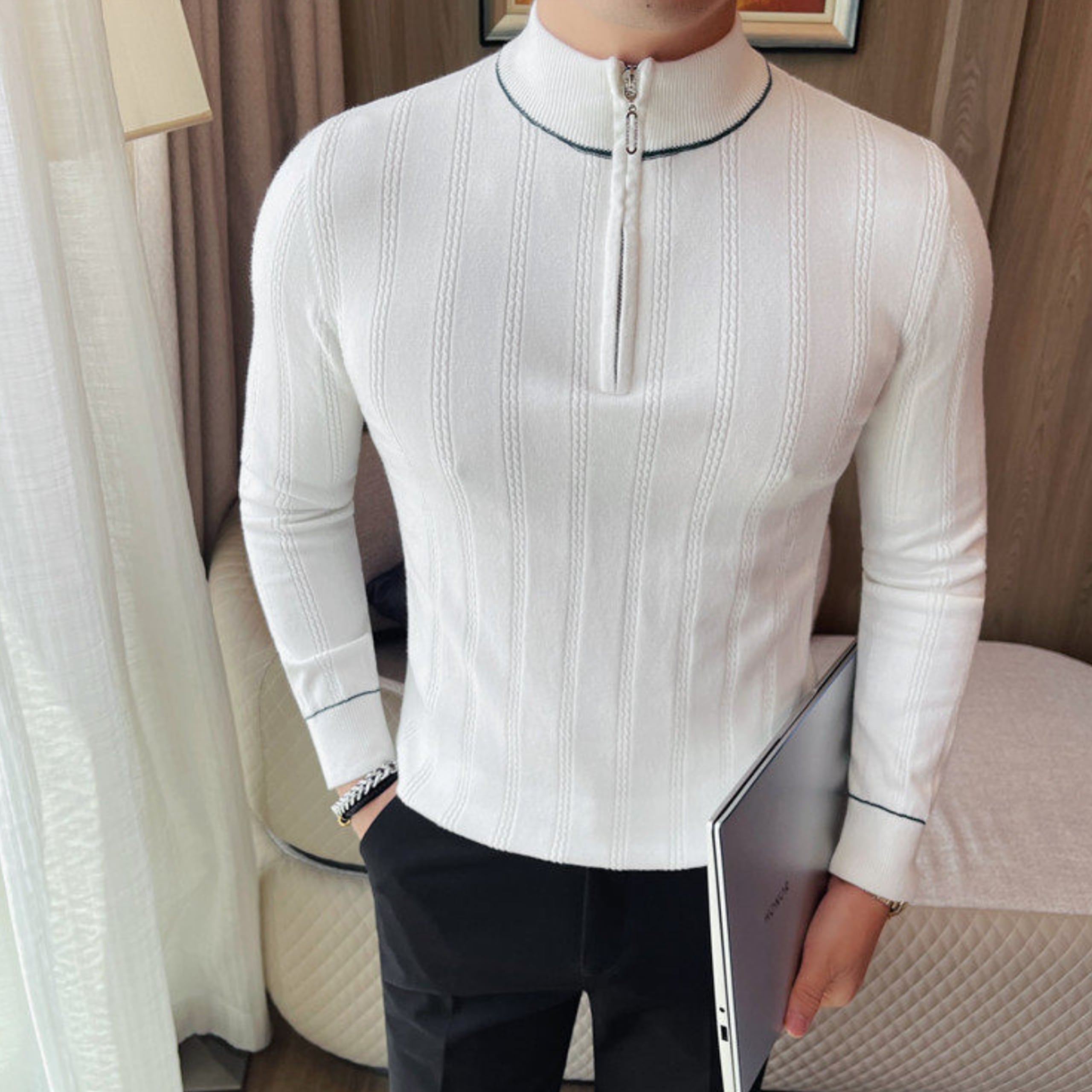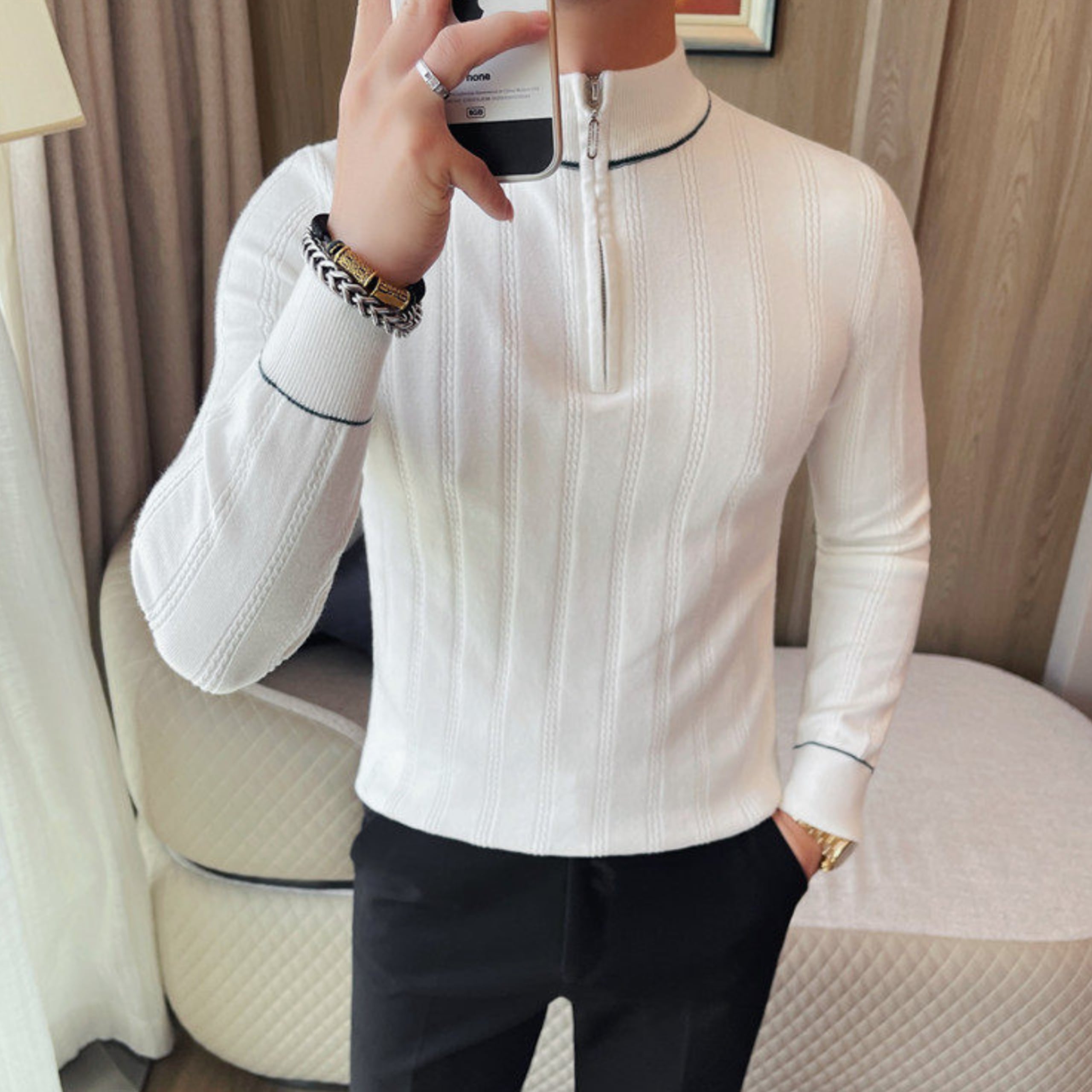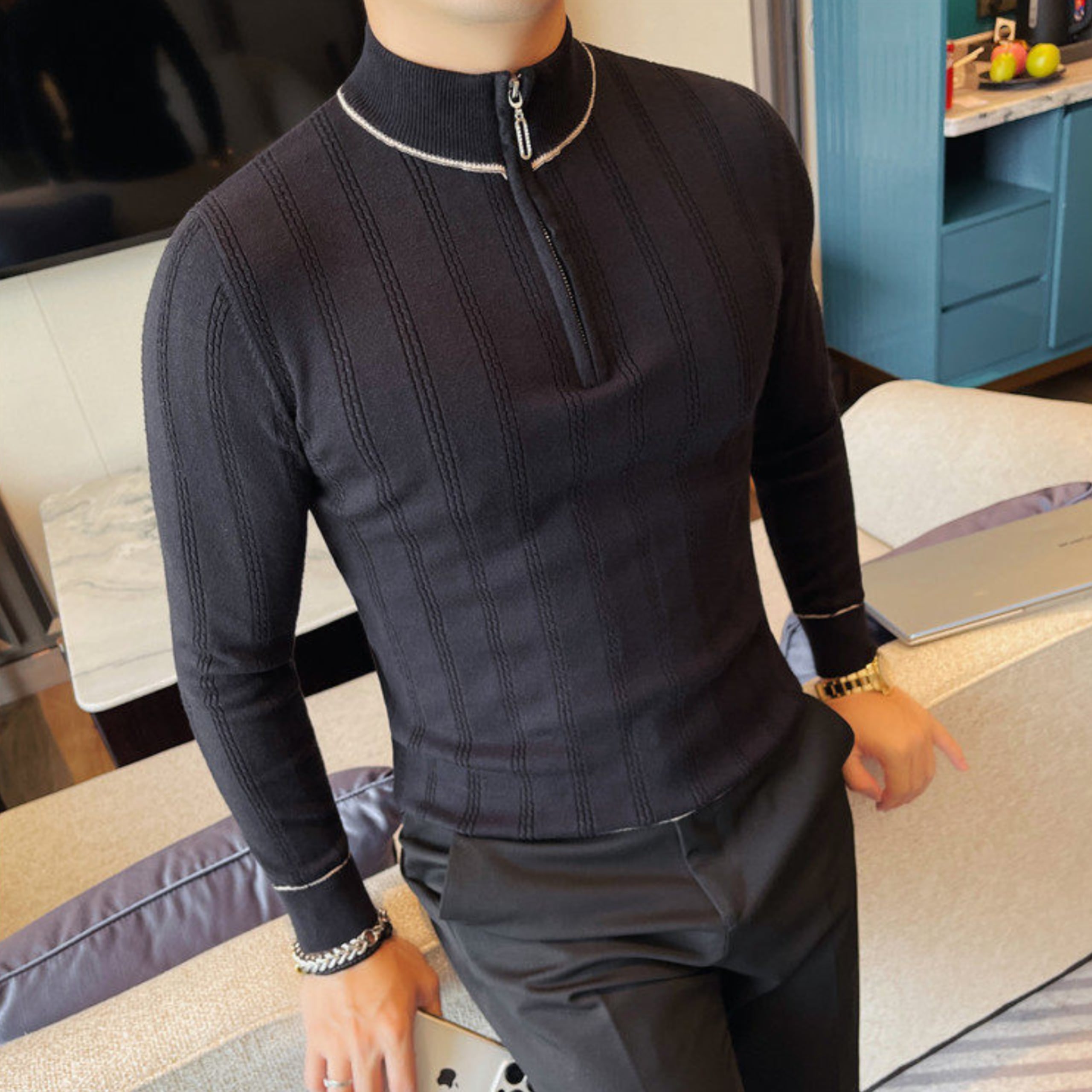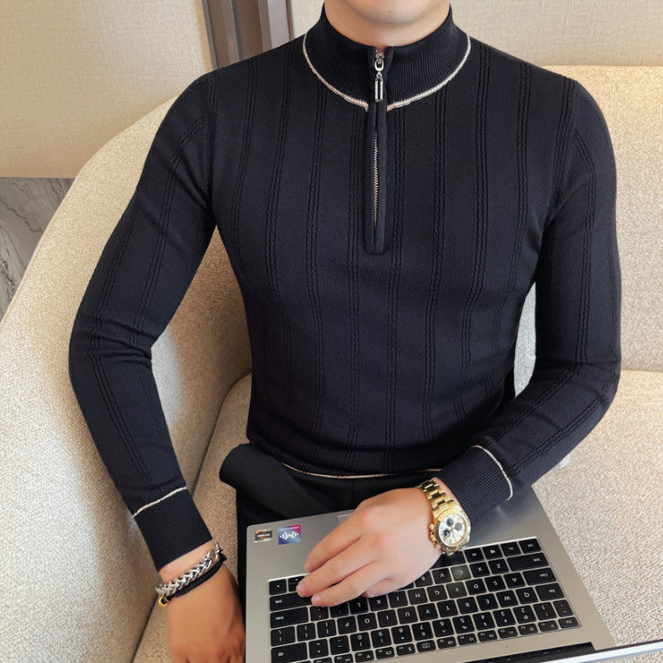 首元をすっきり見せるハーフジップデザインが特徴の一着。
