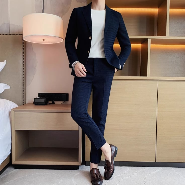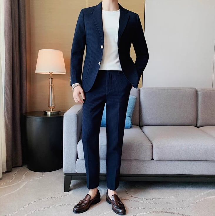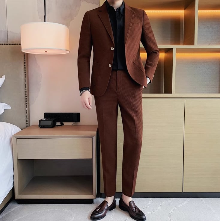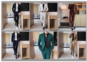 この6色から選べるカジュアルスーツは、ビジネスシーンやカジュアルな場面で活躍します。柔らかな生地と適度なシルエットで、着心地抜群。ジャケットとパンツの2点セットで、コーディネートも楽々です。