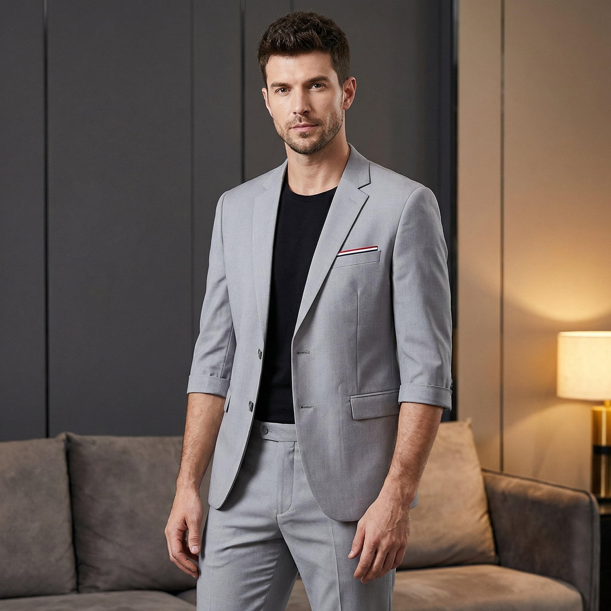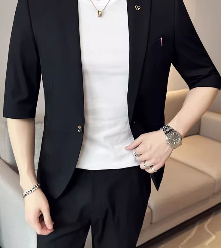 7分丈カジュアルスーツは、洗練されたデザインと快適な着心地が特徴で、ビジネスシーンからカジュアルな場面まで幅広く活躍します。ジャケットとパンツのセットで4色展開なので、コーディネートの幅も広がります。セットアップで着用すれば、一気にお洒落印象を演出できます。