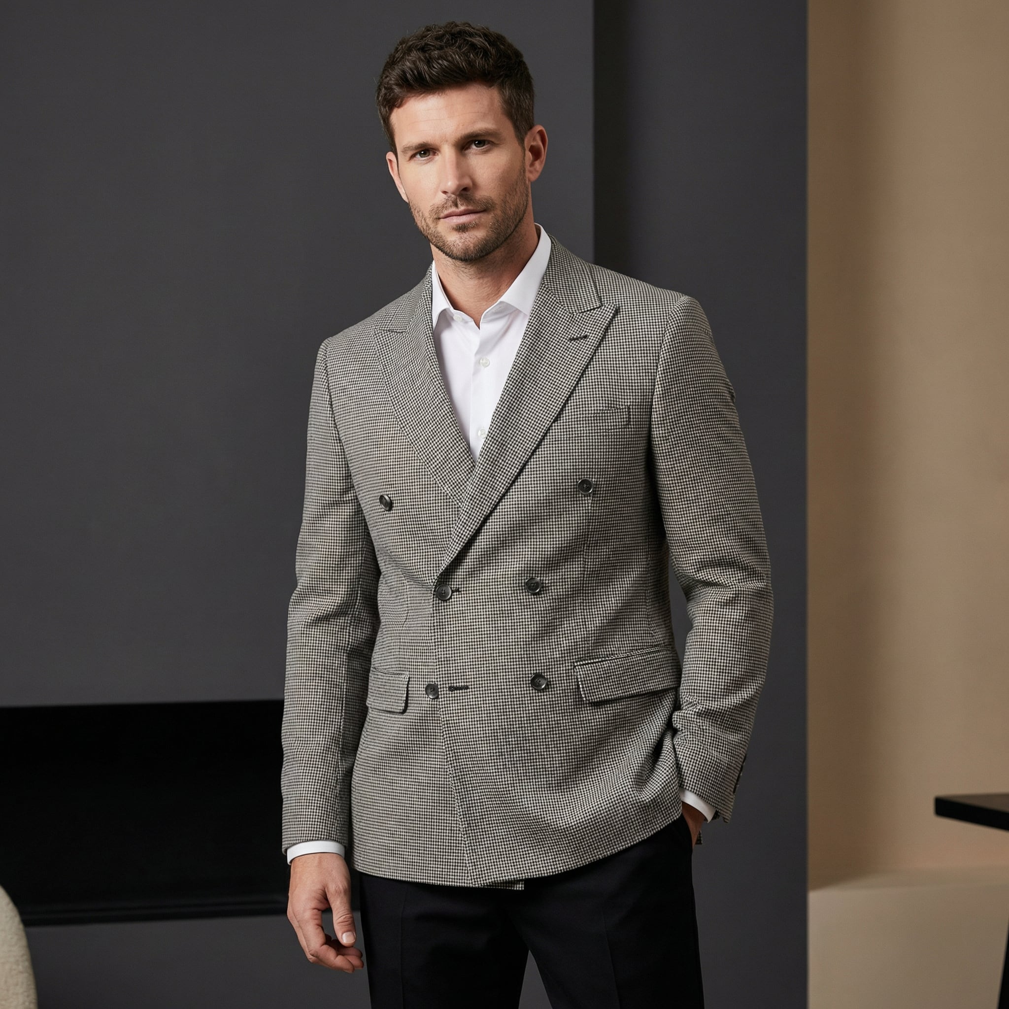 チェック柄スーツメンズジャケット(2color) M0168は、クラシカルなデザインが特徴のジャケットです。上品なチェック柄が大人の男性にぴったりのカジュアルスタイルを演出します。