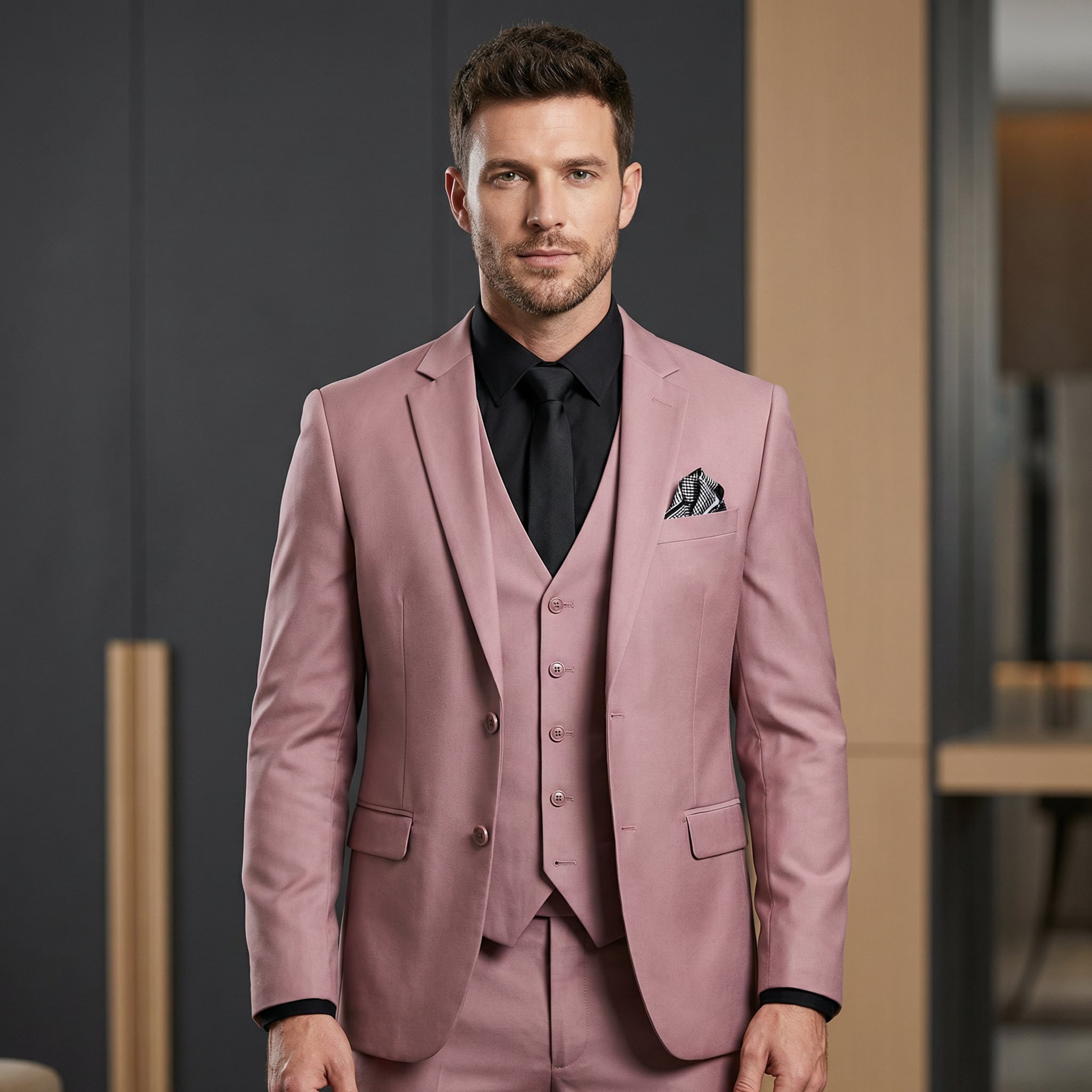 雰囲気ただようハイエンドフォーマルスーツ3点セット。ジャケット、ベスト、パンツがセットになり、着用するだけで一気にエレガントな雰囲気を演出します。ウェディングパーティーなどのフォーマルな場面でも活躍します。