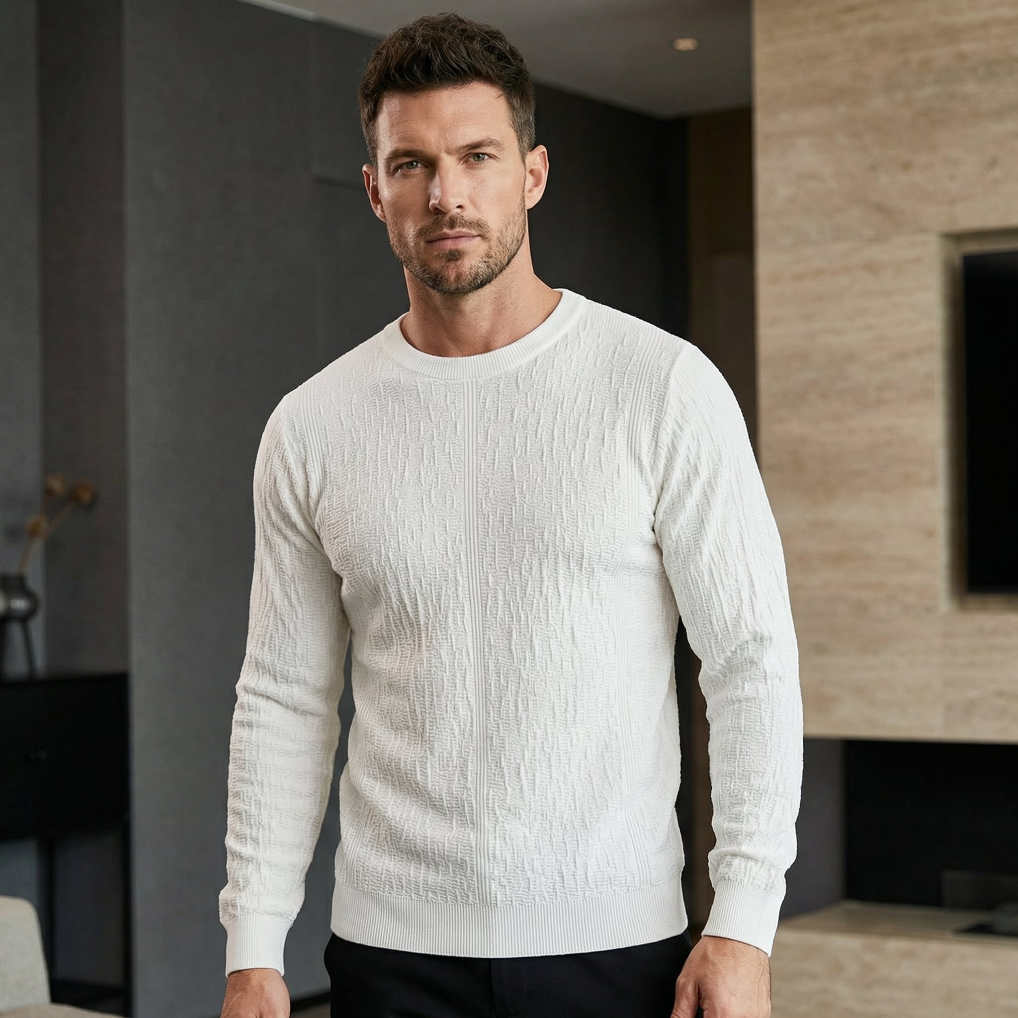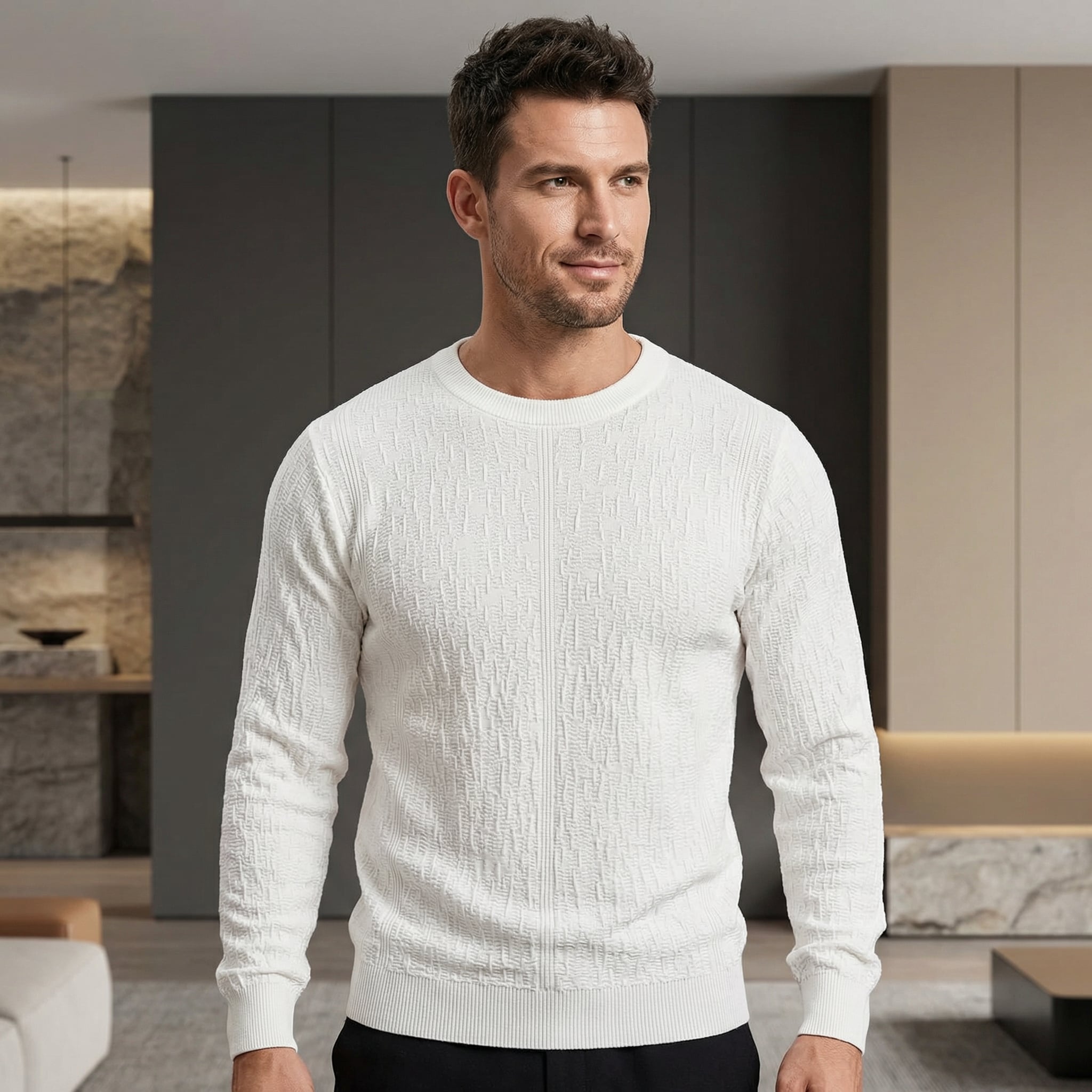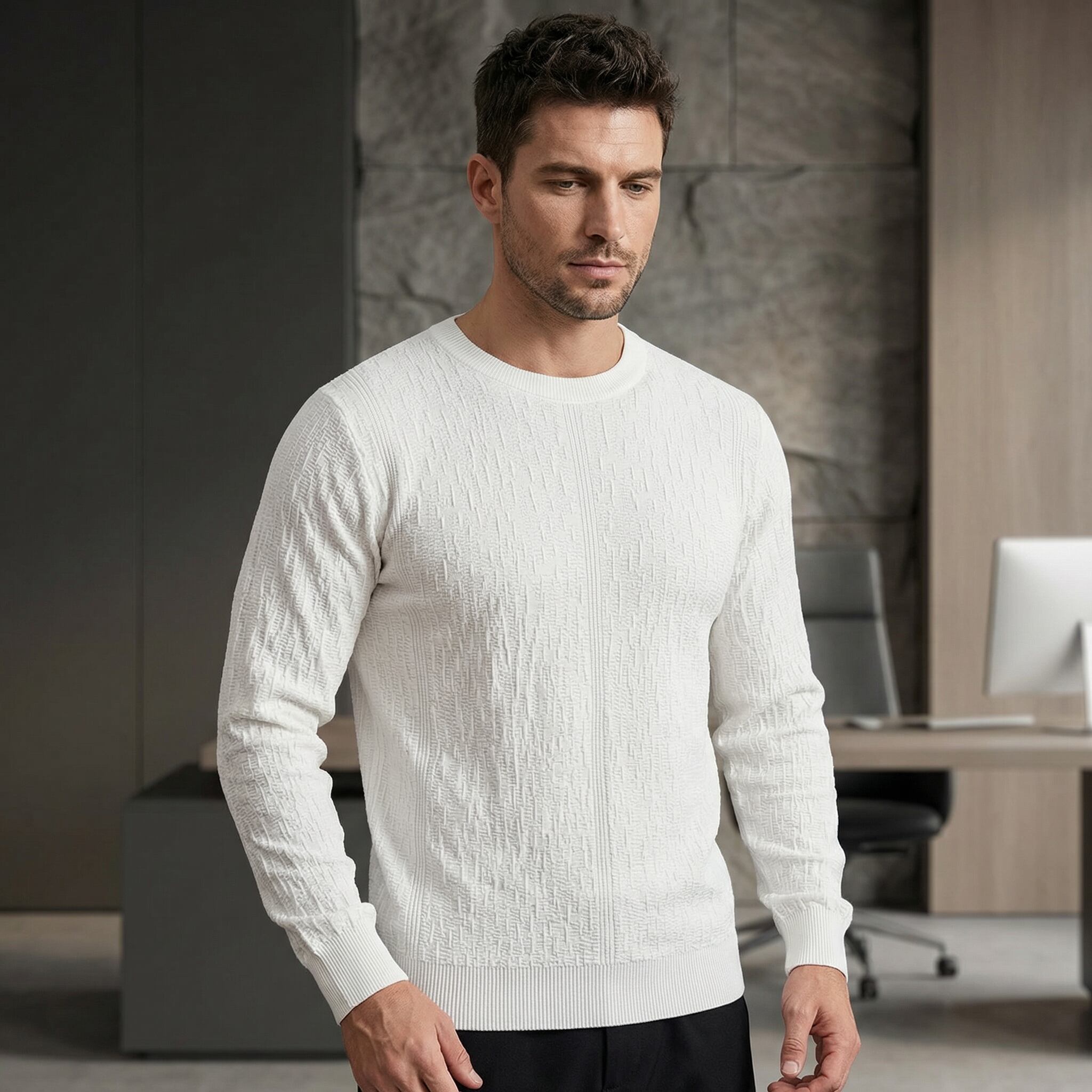 クルーネックのシンプルなデザインながら、メランジ調の凹凸ニットが上品な印象を与えます。一枚で着ても様になり、オフィスシーンからカジュアルな場面まで幅広く活躍します。